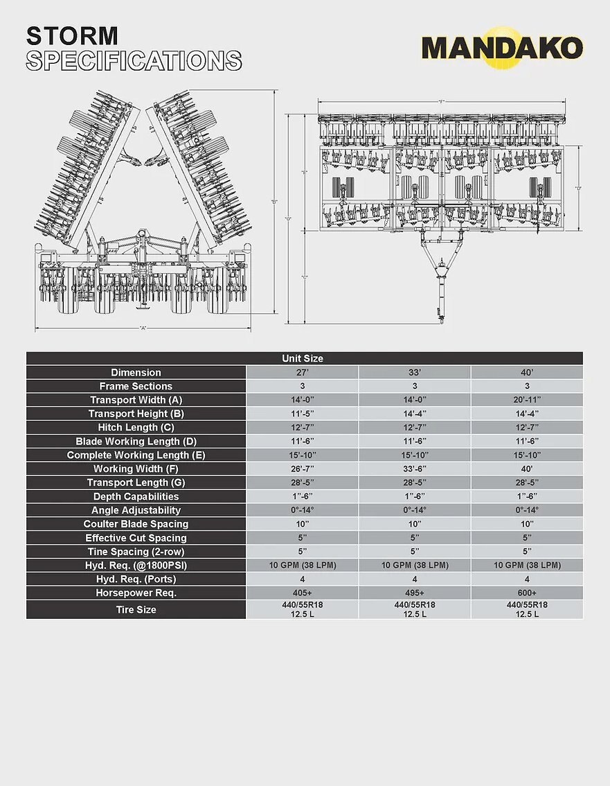 • Innovative Features for Efficiency: The STORM is not just tough; it's smart. With Single Point Depth Control, a Foldable Hitch for compact storage, and color-coded Hydra Grip handles for easy hookup, every detail is designed for your convenience. The patented hydraulic angle adjustment on toolbars offers 0* to 14* of on-the-go adjustability for the perfect finish.