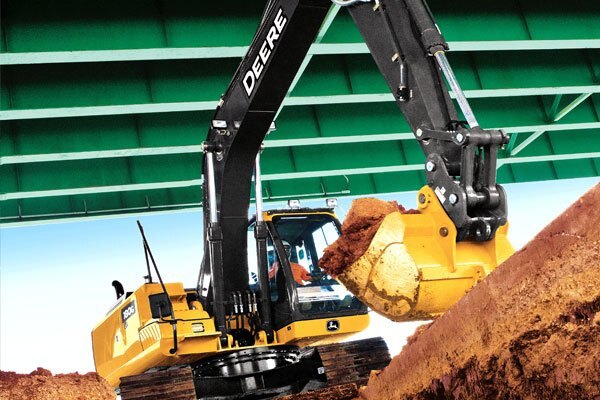 • A John Deere exclusive, three welded bulkheads within the boom resist torsional stress for unsurpassed durability. Booms, arms, and mainframes are so tough; they're warranted for three years or 10,000 hours.