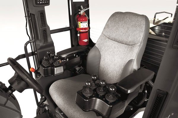 • Auxiliary functions are controlled by mini-levers located on the right-hand armrest and by the larger main-function dual-axis levers.